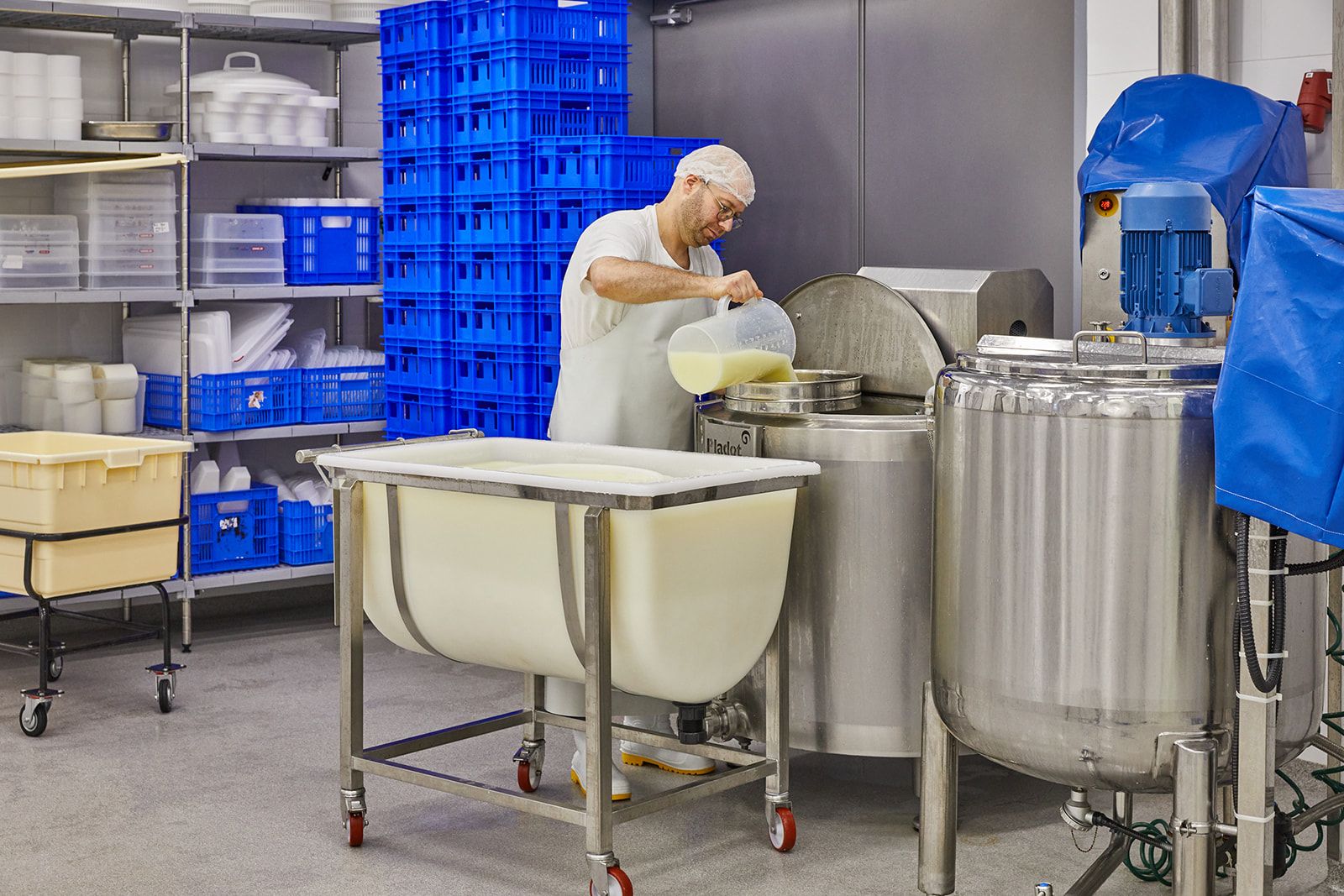 אחרי פיסטור החלב, הוא מועבר לאגנים לבנים שם יעורבבו לתוכו המחמצת והאנזימים המתאימים לכל גבינה.