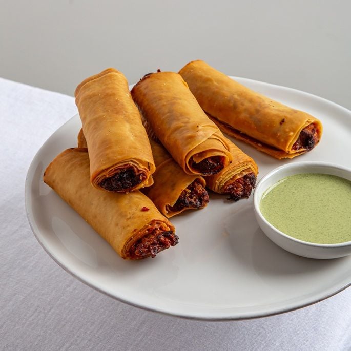 13. אופים כ־40 דקות, עד שהסיגרים שחומים ופריכים (לחלופין, אפשר למלא ולגלגל את הסיגרים, ואז להקפיא אותם לפני האפייה).