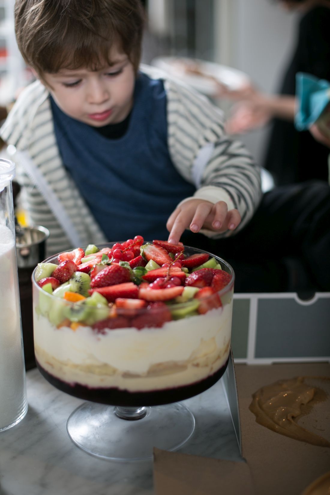 חזרנו לסלון לקינוח: טרייפל מסקרפונה ופירות טריים נהדר, שהוגש עם פורט.