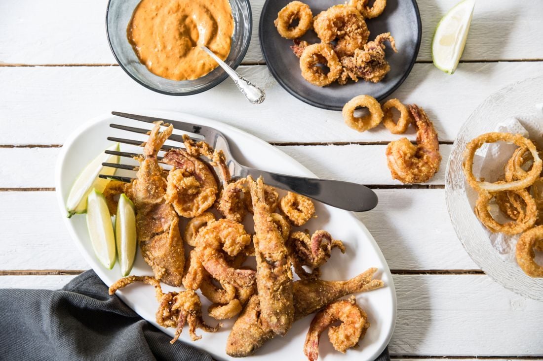 ואחרי שניקיתם, קילפתם וחתכתם את יצורי הים לקראת ציפוי וטיגון, עשו לעצמכם טובה ותפרסו גם בצל שלם, טבעות טבעות, והעניקו לו טיפול דומה. האושר מחכה שם בסוף.