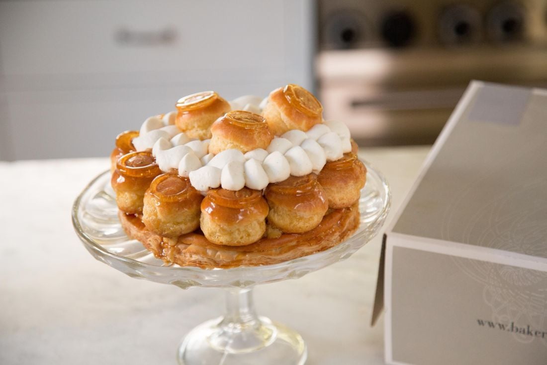 סנט אונורה - עוגה חגיגית עם תחתית בצק עלים, פחזניות במילוי קרם פטיסייר מקורמלות, קרם מוסלין וקצפת וניל.
