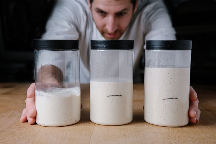 - אחרי 24 שעות, מערבבים 100 גר' מהתערובת של המים והקמח יחד עם 100 גר' מים ו-100 קמח נוספים. להתסיס במשך 24 לשעות נוספות, בכלי הסגור על השיש.